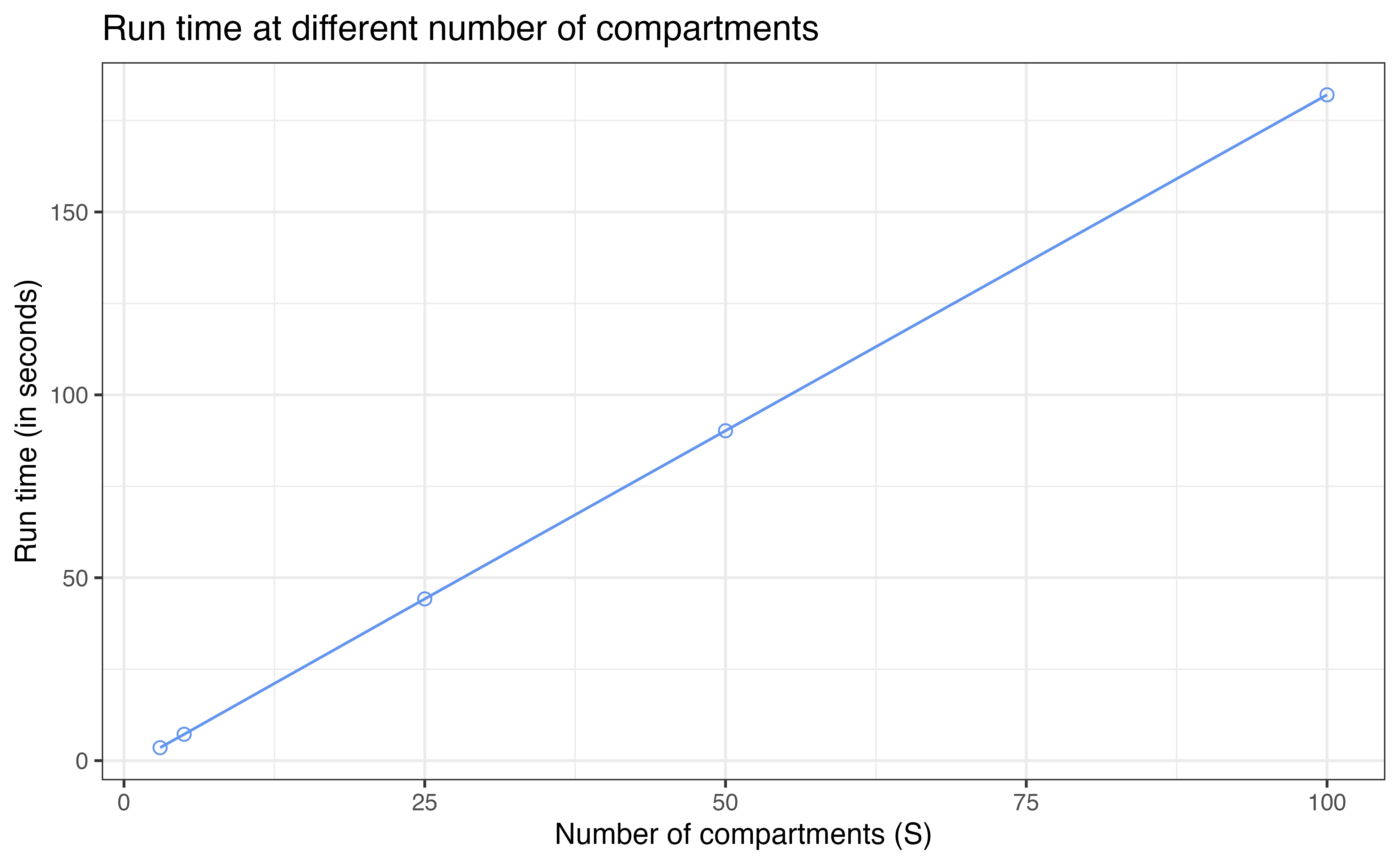 times <- seq(0, sim_duration)The plot below summarizes the run time and accuracy at different