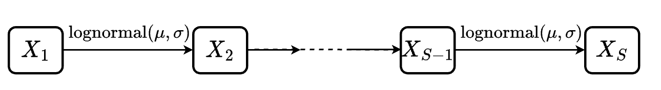 The duration for any transition \(X_i \rightarrow X_{i+1}\) is set to follow a log-normal distribution with \(\mu = 2.2\) and \(\sigma = 0.4\)
