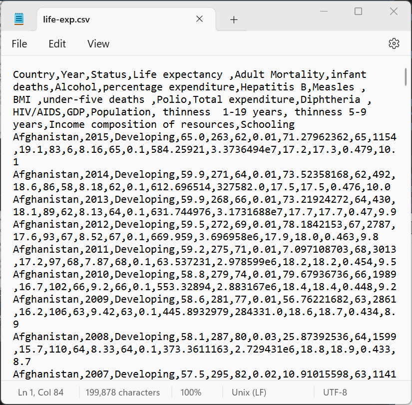 read.table()sep: các cột trong text file ngăn cách nhau bằng kí tự gì. Ví dụ file life-exp.csv nếu chúng ta mở bằng Notepad sẽ thấy các cột ngăn cách nhau bằng dấu ,.read.table()Chúng ta đọc file life-exp.csv vào R như sau:
