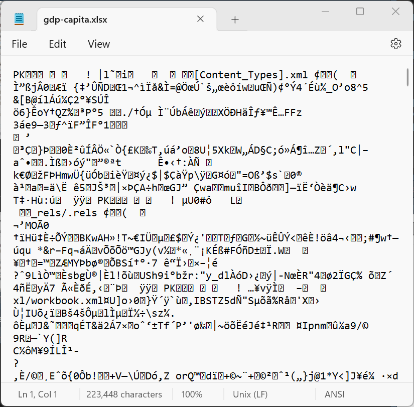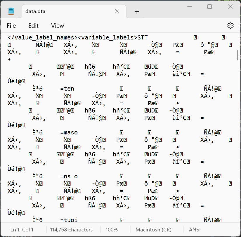 .csv và .json khi mở bằng NotepadLà những files khi mở bằng text editor như Notepad thì không đọc được các chữ trong file. Các files như .xlsx, .dta đều là binary files. Binary files cần được mở bằng các phần mềm chuyên dụng, ví dụ dùng Excel để mở file .xlsx thì mới đọc được dưới dạng chữ human-readable. Bản thân R không đọc được các loại file này, nhưng chúng ta có thể cài đặt và sử dụng các R packages để đọc binary files.