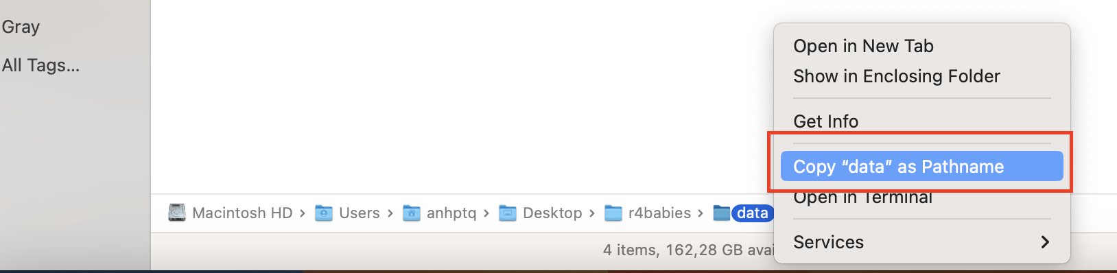 Trong ví dụ sau, đường dẫn được copy là /Users/anhptq/Desktop/r4babies/data
