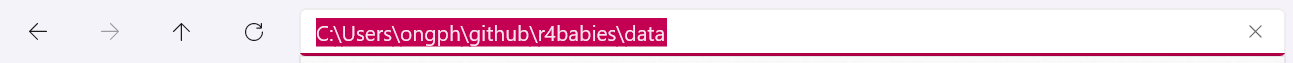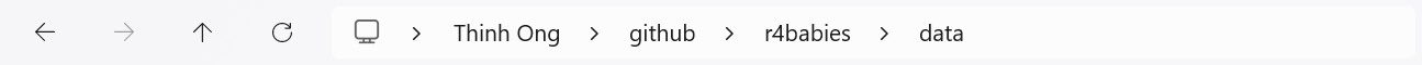 Trong ví dụ trên, C:/Users/ongph/github/r4babies/data là đường dẫn tuyệt đối (absolute path). Absolute path là path đầy đủ từ đầu ổ đĩa cho đến file hay folder hiện tại.